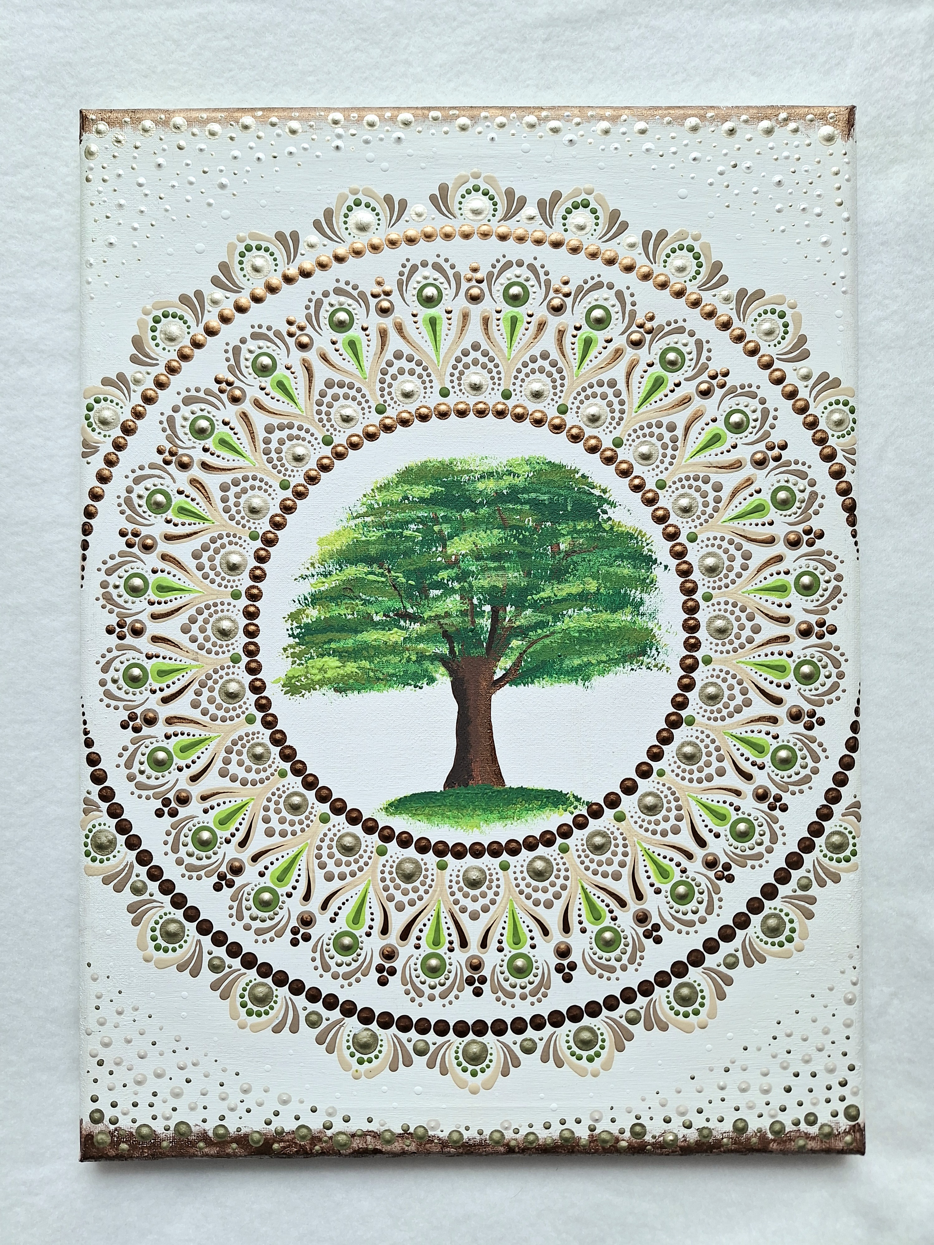 A hófehér alap nem csupán háttér, hanem a végtelen tér szimbóluma, amelyből a központi fa szinte sugározza magából a fényt. A pontozott technika és a festett motívum találkozása izgalmas, mélységet ad a képnek, amely a fény beesési szögétől függően mindig más arcát mutatja. Az arany csillogása a bőséget és a nap melegét, a barnák a stabilitást, földelést, a zöldek pedig a megújulást és a belső békét csempészik a térbe. Ez az alkotás nem csupán egy dekoráció, hanem a harmónia szigete, amely emlékeztet minket saját belső erőnkre és a világunkat átfogó végtelen körforgásra. Letisztult színvilága és elegáns megjelenése miatt bármely otthon központi dísze lehet, nyugalmat árasztva környezetében.