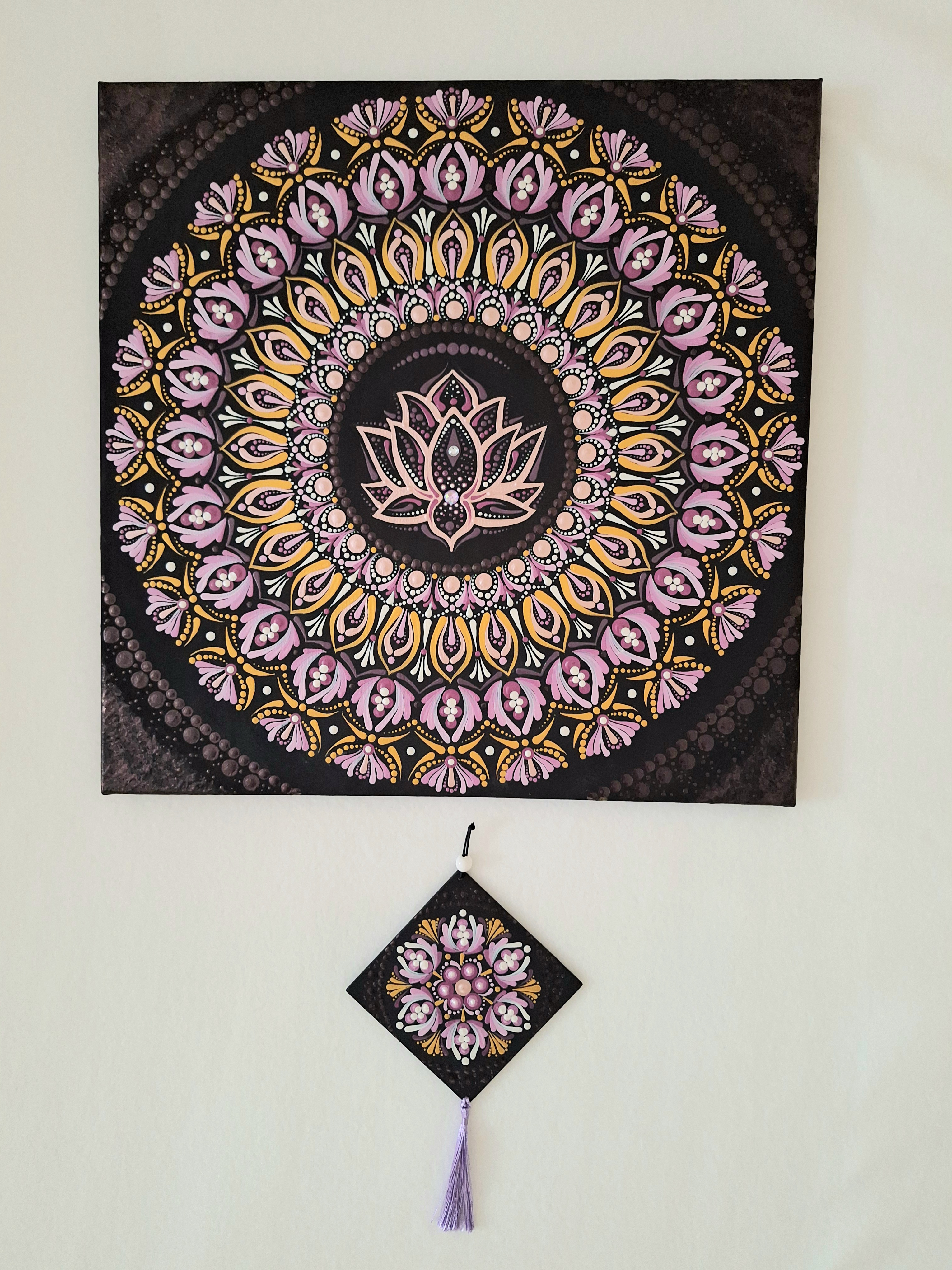 Ez a mandala nemcsak esztétikus dekoráció, hanem támogató energetikai szimbólum is, amely nyugalmat, pozitív rezgéseket és emelkedett hangulatot hoz a térbe.