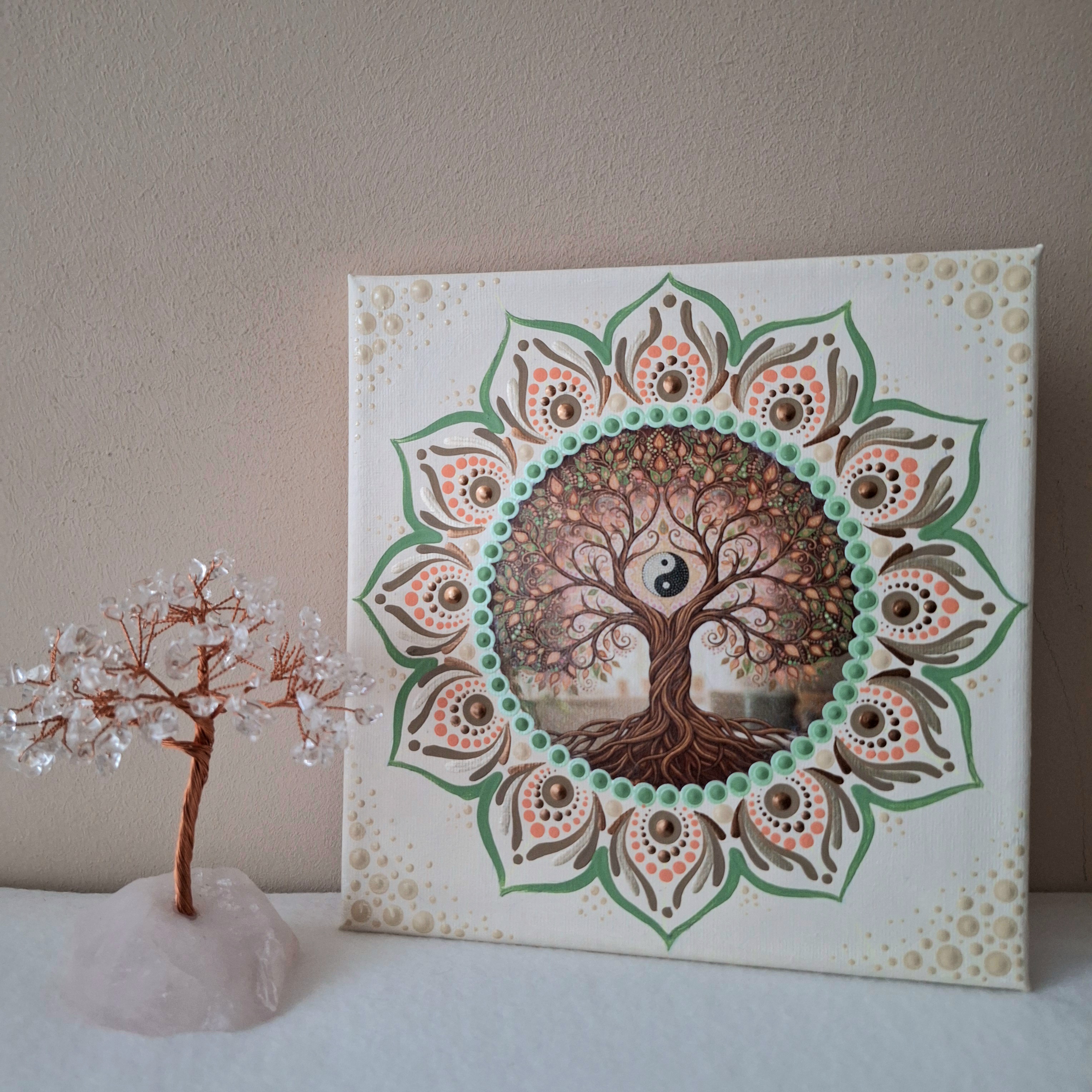 Az Életfa a körforgás és fejlődés, a Jin-Jang szimbólum az egyensúlyt, a földszínek pedig az anyaföld megnyugtató erejét idézik.